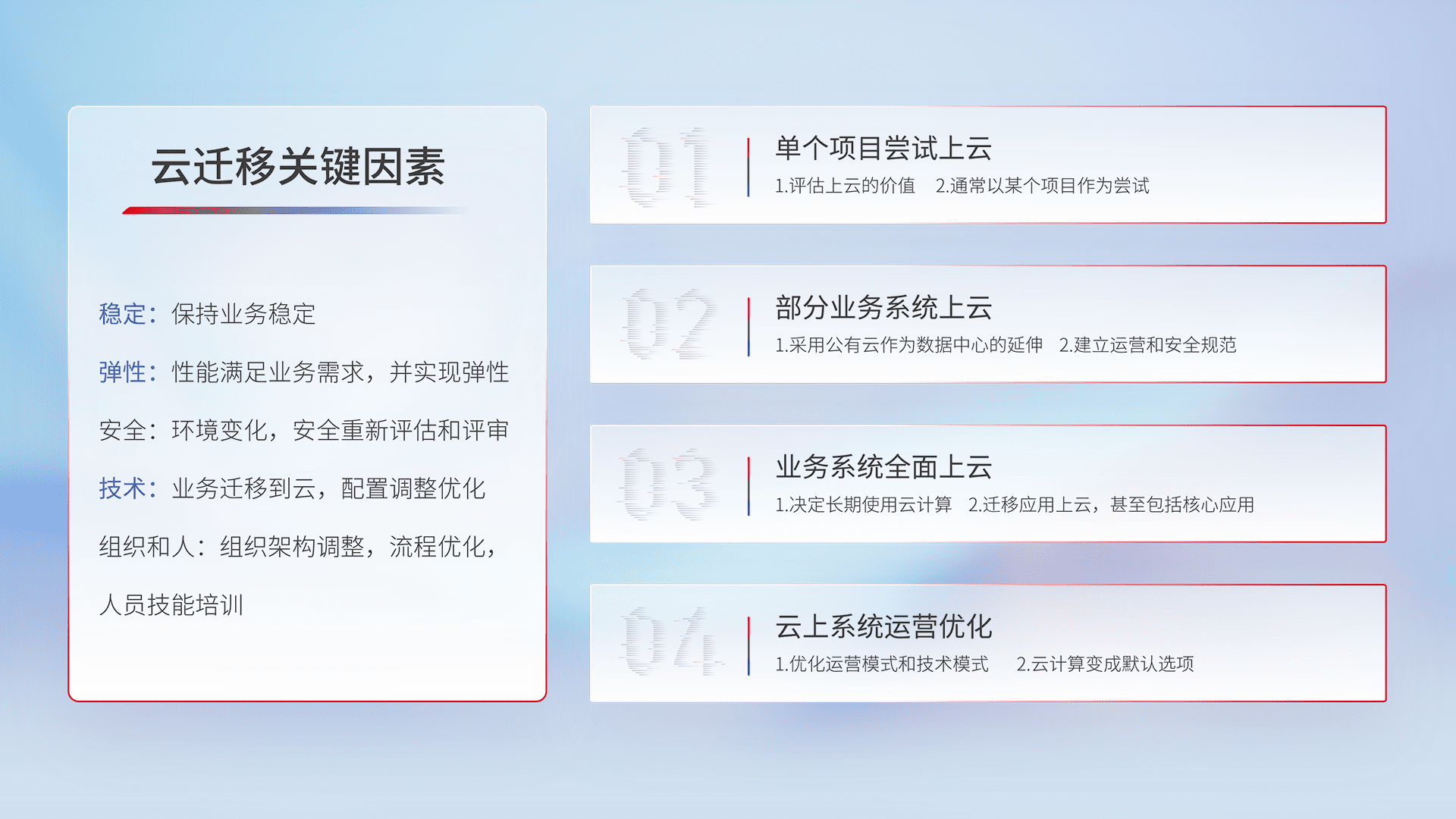 结合实际业务,,从规划设计、、、、云平台选型、、、云原生改造、、、、数据迁移、、集成交付,,迁移全过程为客户识别最佳上云路径,,做好风险识别管理,,设计网络架构、、身份权限、、、、安全审计合规、、、操作审计、、日志审计、、、监控告警策略、、多站点容灾设计等,,,对云上基础设施进行整体规划,,,,提升IT治理水平,,以满足弹性、、、高可用、、、、高性能的需求。。